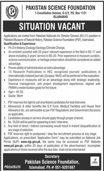 Candidates, if you are seeking Pakistan Science Foundation Jobs 2025 in Islamabad, Apply Online yes. then it would help if you tried to complete the Pakistan Science Foundation Jobs because here you can easily apply for this vacancy: Director General BS-21.